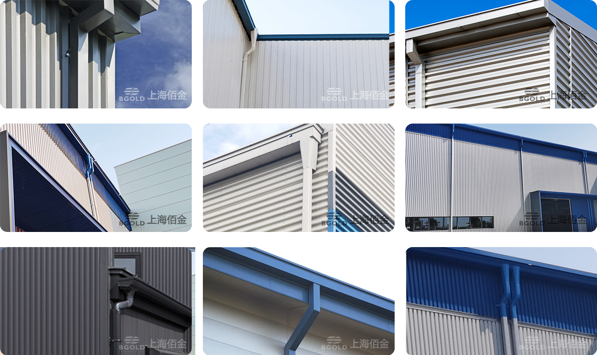 天溝和落水管的材質,都選用與屋墻面相同的材質保證其壽命的一致性;